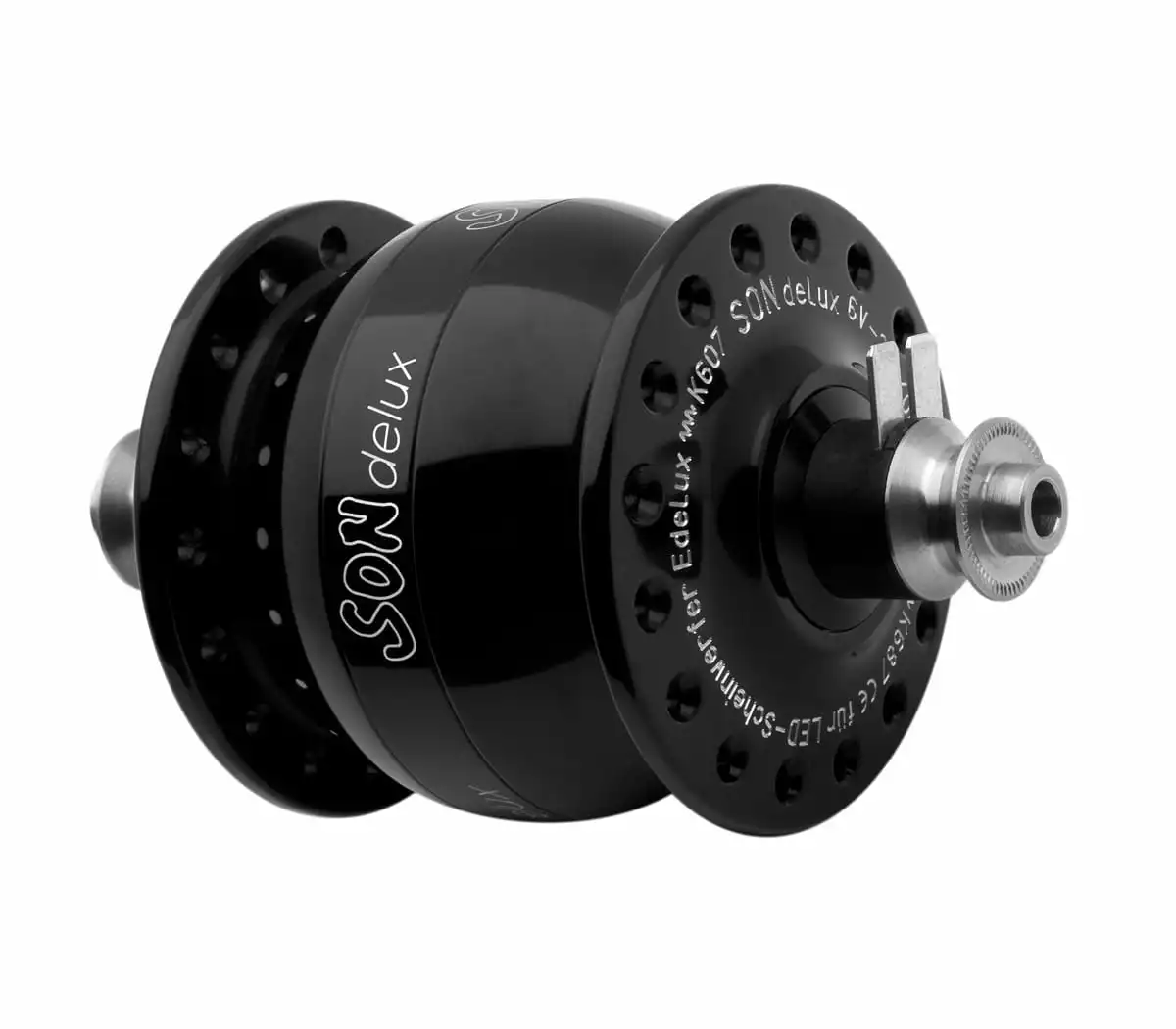 De SONdelux is de eerste naafdynamo waarvan de generator speciaal is ontworpen voor moderne LED-koplampen (zoals Edelux en B&M Cyo). Sinds december 2009 heeft de SONdelux – in combinatie met Edelux – StVZO-goedkeuring voor alle wielmaten (16” – 28”). In tegenstelling tot halogeenlampen zijn LED’s zeer effectief, zelfs bij gedeeltelijke belasting, d.w.z. wanneer ze onder hun nominale vermogen werken. Het is dus niet meer nodig de dynamo zo te bouwen dat hij zijn volle vermogen bereikt bij de laagst mogelijke rijsnelheid. De SONdelux is dus kleiner en lichter dan een naafdynamo voor halogeenverlichting (SON 28). Het stroomverbruik in onbelaste werking is met 30 Ã 35% gedaald in vergelijking met de SON 28. Qua robuustheid en hoogwaardige vormgeving is de SONdelux echter gelijk aan de SON 28.